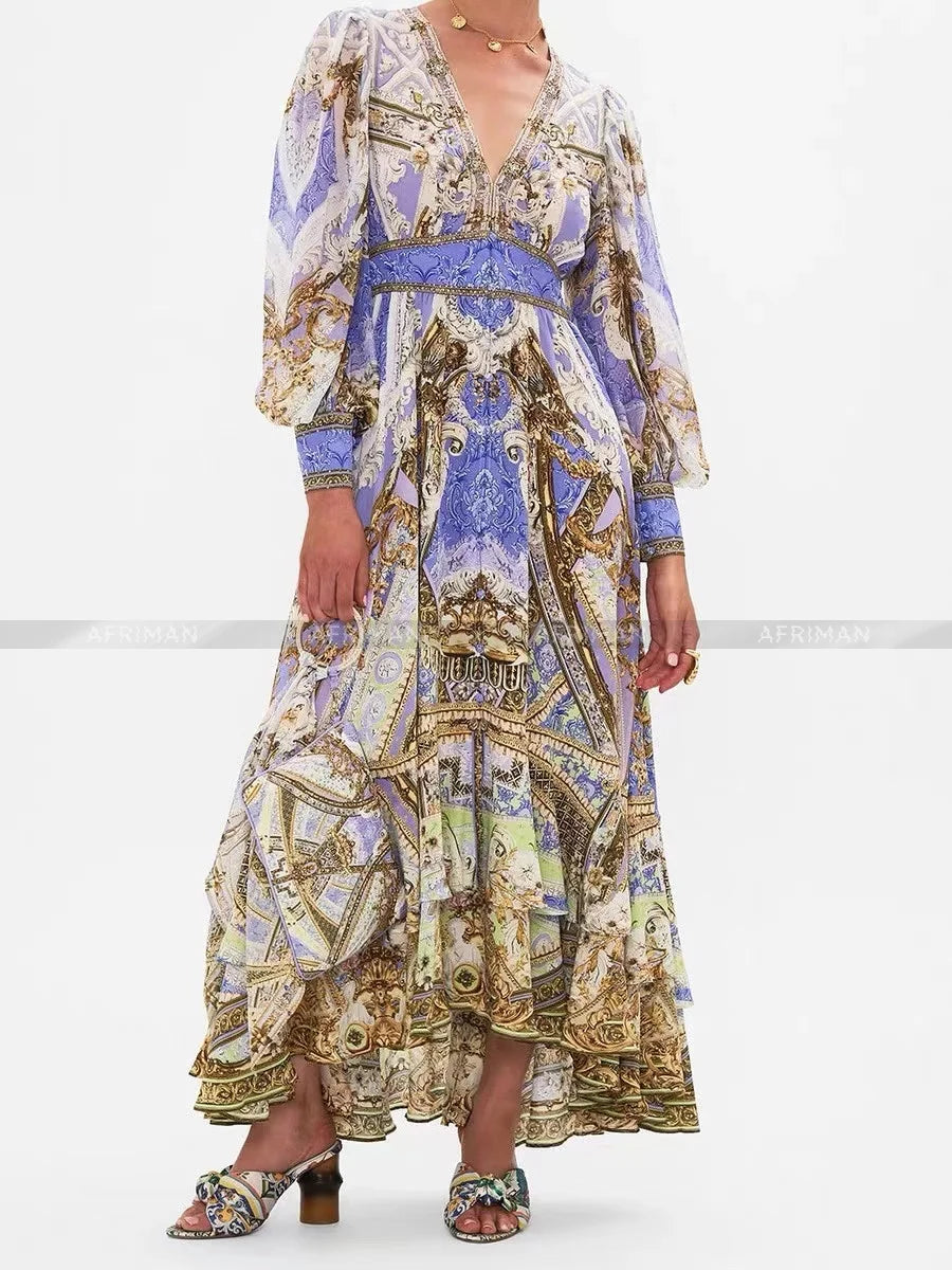 Designer Dress New Bohemian Style V Neck Purple Flower Print Long